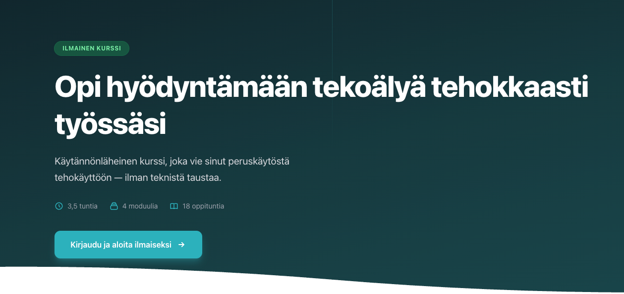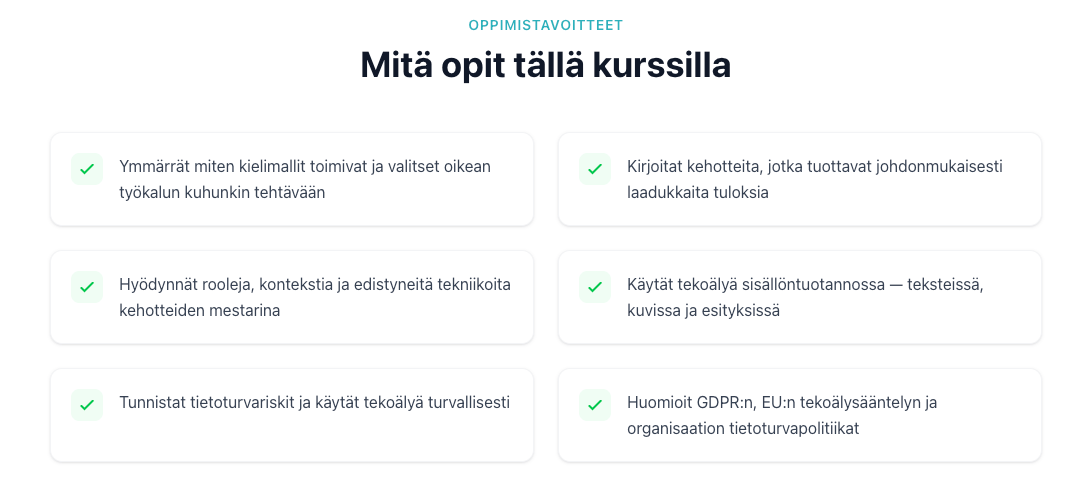 Tämä on lähtöpiste. Kurssi kattaa kielimallien toimintaperiaatteet, kehotteiden kirjoittamisen, sisällöntuotannon tekoälyllä ja turvallisen käytön pelisäännöt.