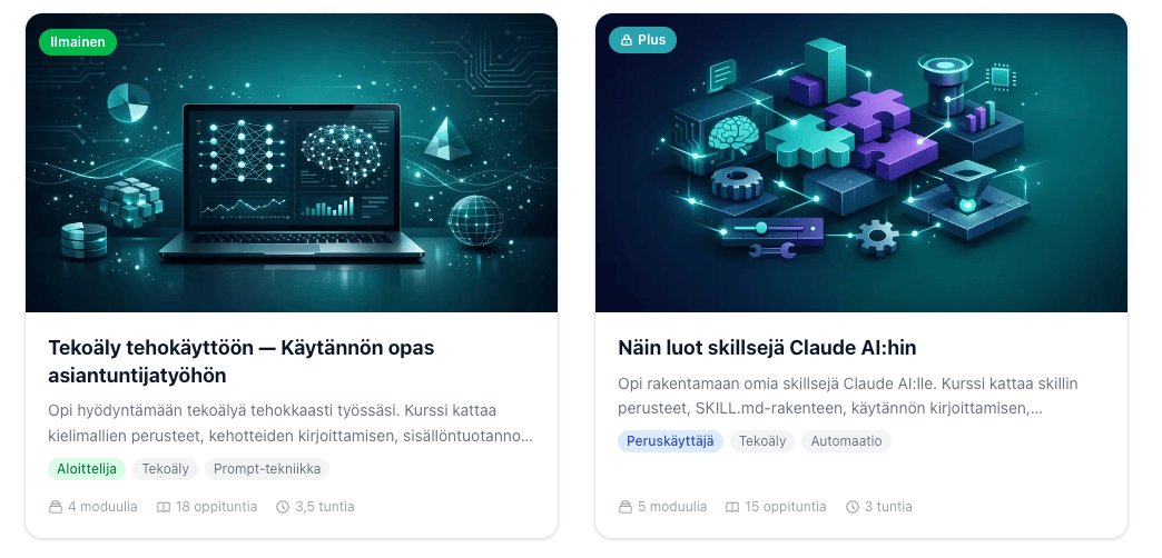 Ilmaisen kurssin jälkeen voit jatkaa Plus-kursseilla. Ne kattavat muun muassa AI-agenttien rakentamisen, Claude Skills -automaatiot ja edistyneen tekoälyn käytön.