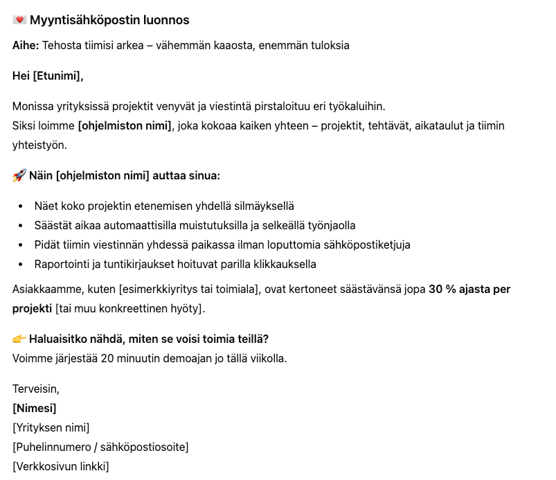 Huomaat välittömästi eron tuloksissa. Yksinkertainen kehote tuottaa yleisen, kaavamaisen sähköpostin joka voisi olla kenelle tahansa yritykselle. Se sisältää tyypillisiä fraaseja kuten "mullistava ratkaisu" ja "tehosta liiketoimintaasi" ilman todellista syvyyttä.