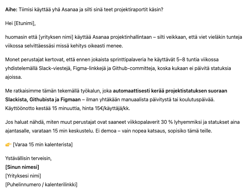 Konteksti: Kohderyhmänä ovat startup-yritysten perustajat ja pienten (5-20 henkilöä) tuotekehitystiimien johtajat jotka käyttävät tällä hetkellä Asanaa tai Excel-taulukoita projektinhallintaan. He ovat tyytymättömiä siihen että tiimin jäsenet eivät päivitä tilastatietoja ajoissa, deadline-slippage on yleistä ja he itse käyttävät 5-8 tuntia viikossa projektistatuksen keräämiseen eri lähteistä. Meidän ohjelmistomme maksaa 15€/käyttäjä/kuukausi, on käytössä 15 minuutissa ilman IT:n apua ja automatisoi päivitykset integroitumalla suoraan Slackiin, Githubiin ja Figmaan. Kilpailijat ovat joko liian kalliita (Asana 25€/käyttäjä) tai liian monimutkaisia (Monday vaatii päivän koulutuksen).