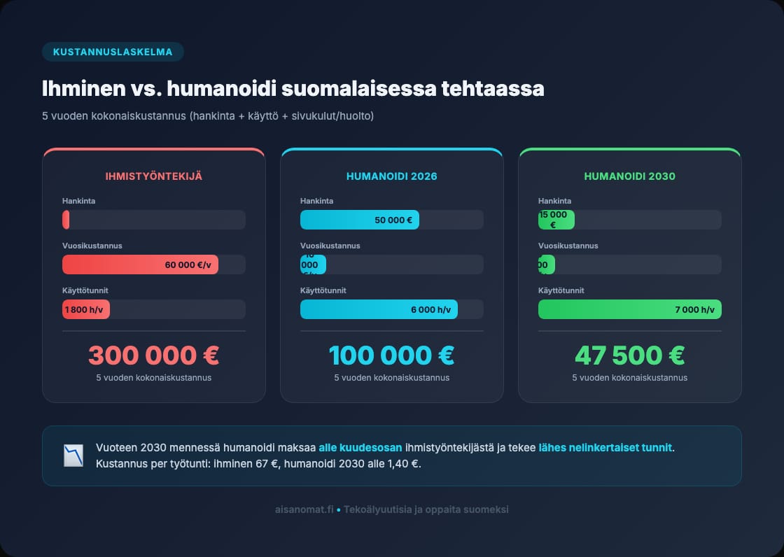Luvut eivät ole tarkkoja -- humanoidien todellinen tuottavuus riippuu tehtävästä ja teknologian kypsyydestä. Mutta suunta on selvä. Vuoteen 2030 mennessä humanoidi voi maksaa viidesosan ihmistyöntekijästä ja tehdä kolminkertaiset tunnit.