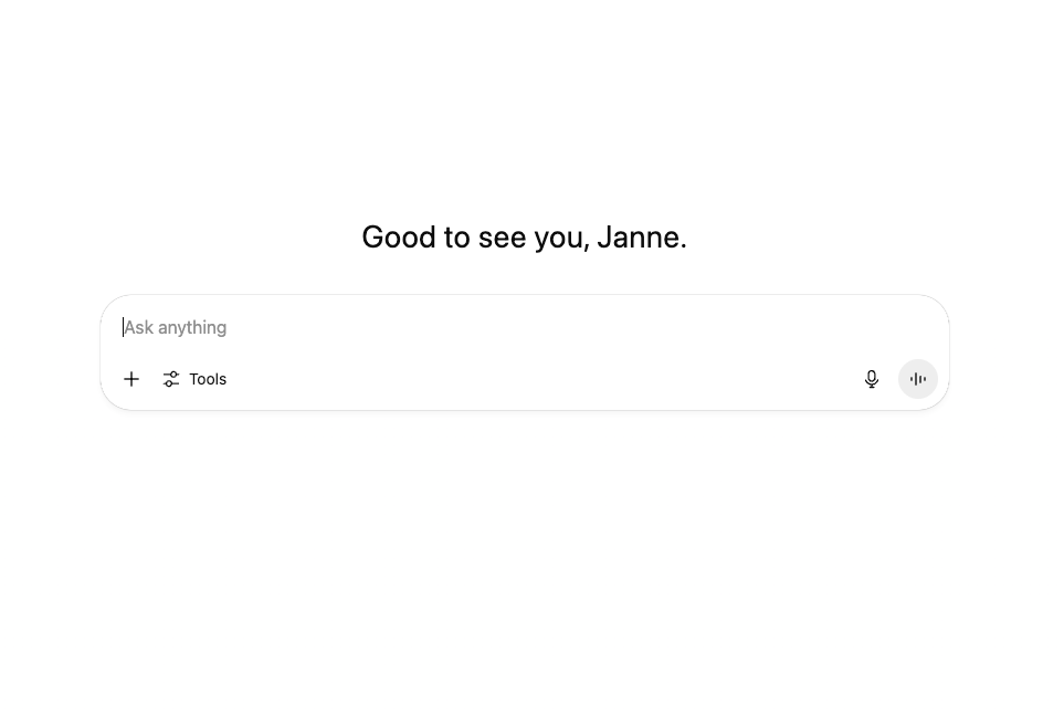 Aloitusnäytössä on tekstikenttä, johon voit kirjoittaa kysymyksesi tai tehtäväsi suomeksi tai muulla kielellä. Napsauta “Ask” tai lähetyspainiketta.