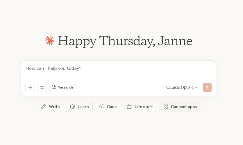 Kirjautumisen jälkeen avautuu keskusteluikkuna, hyvin samankaltainen kuin ChatGPT:ssä. Voit kirjoittaa kysymyksiä tai tehtävänantoja suomeksi. Claude ymmärtää useita kieliä – sen on raportoitu toimivan sujuvasti mm. ranskaksi, saksaksi, espanjaksi, italiaksi jne., joten suomikin onnistuu hyvin.