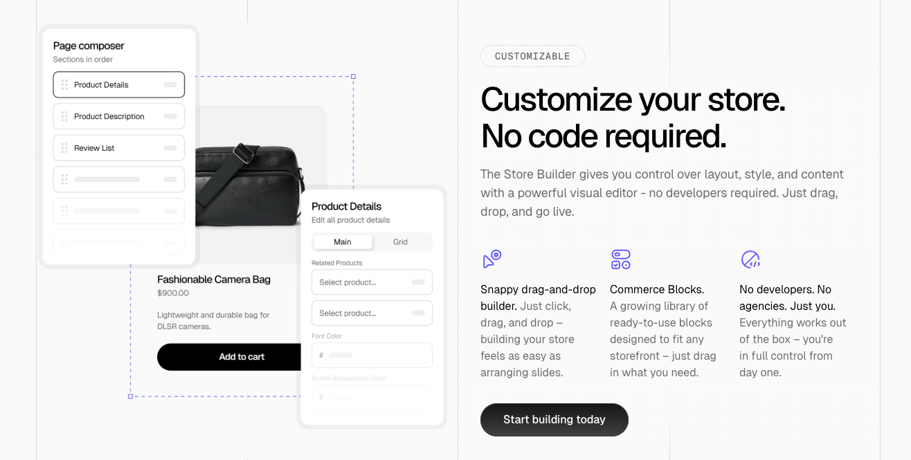 Alusta painottaa yksinkertaisuutta ja nopeutta – useimmat myyjät saavat kauppansa käyntiin alle puolessa tunnissa ilman kehittäjien apua. Sisäänrakennettu visuaalinen editori mahdollistaa ulkoasun ja sisällön muokkaamisen helposti, ja kaikki toimii valmiiksi ilman monimutkaisia asetuksia.