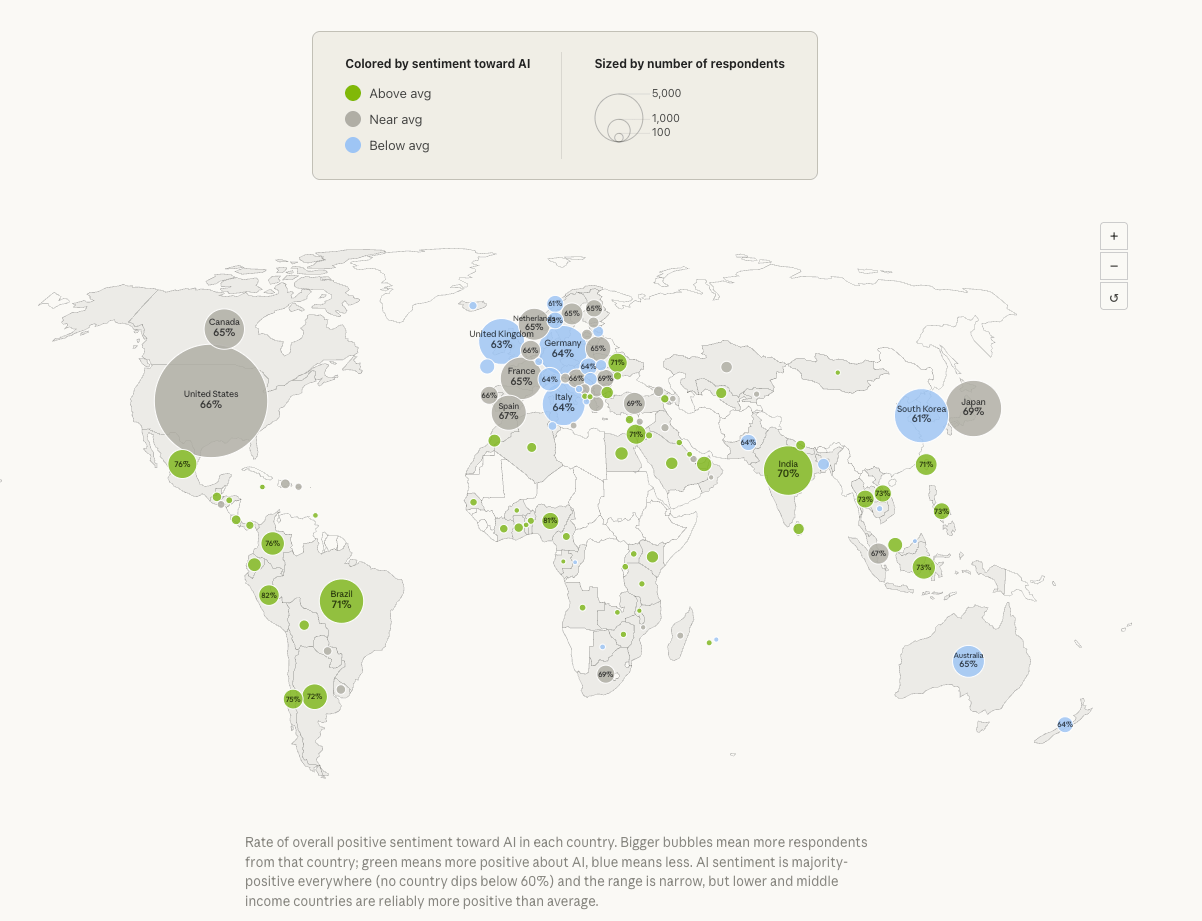 Globaalisti 67 prosenttia suhtautuu tekoälyyn myönteisesti. Mutta erot ovat selviä, ja ne kulkevat vaurauden rajapintaa pitkin.