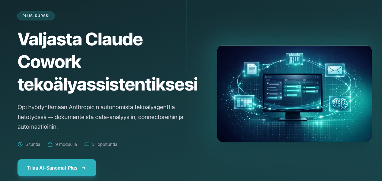 Tsekkaa AI-Sanomien kattava Claude Cowork -verkkokurssi. Se opettaa sinulle kaiken mahdollisen Claude Coworkin käytöstä ja sisältää kaikki uudet ominaisuudet sekä esimerkki-käyttökohteet.