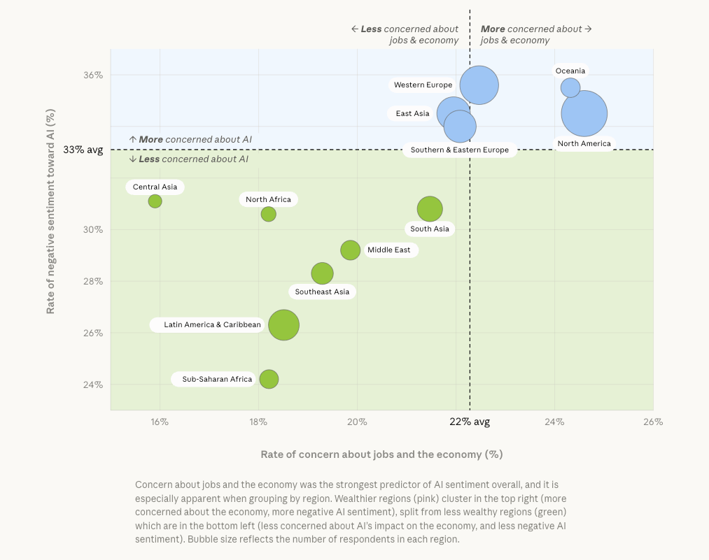 Työpaikkahuoli ennustaa asennetta vahvimmin. Mitä enemmän ihminen pelkää työpaikkansa puolesta, sitä negatiivisemmin hän suhtautuu tekoälyyn. Pohjois-Amerikassa työpaikkahuoli nousi korkeimmaksi (24,6 prosenttia), Saharan eteläpuolisessa Afrikassa matalimmaksi (18,2 prosenttia).