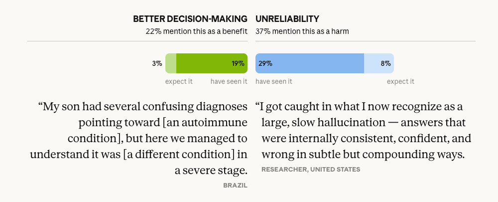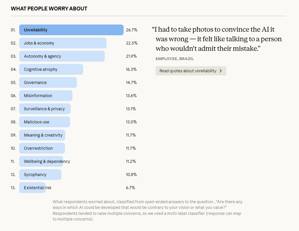 Lähteet: Anthropic, "What 81,000 people want from AI" (2026), Anthropic Interviewer -tutkimusmenetelmä