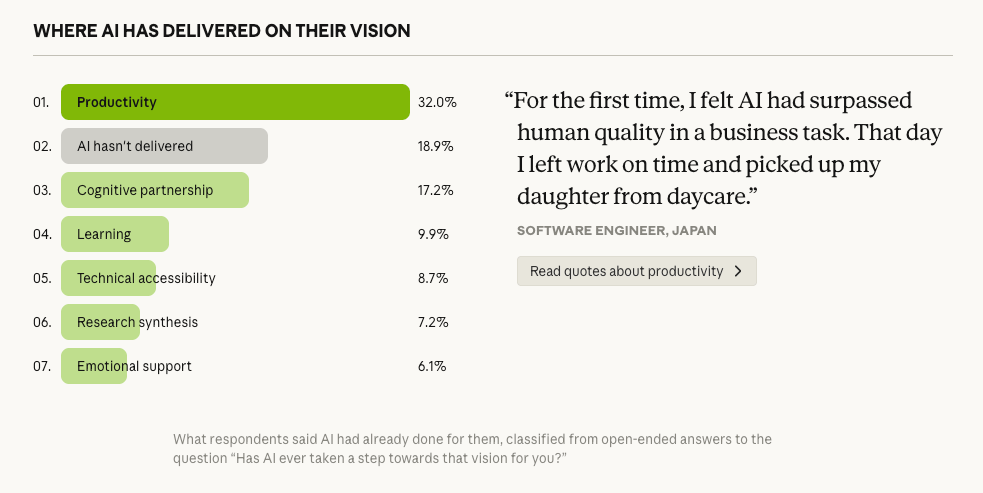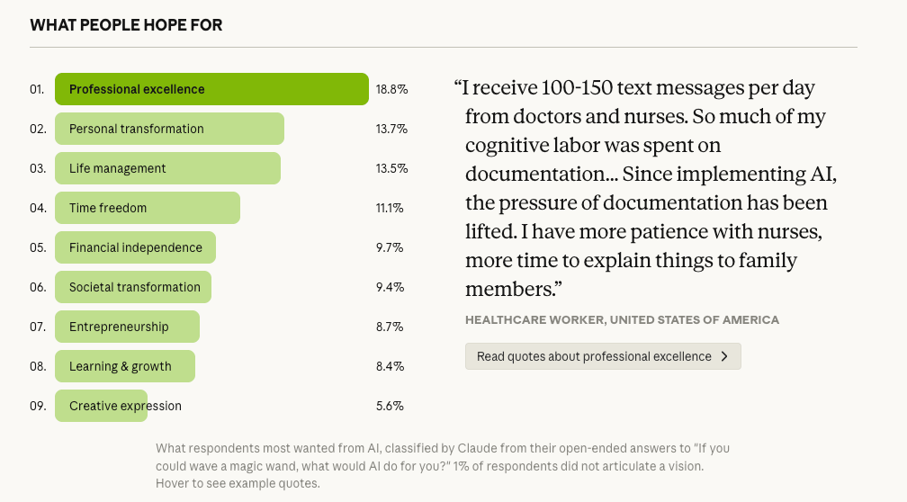 Moni aloitti haastattelun puhumalla tuottavuudesta. Mutta kun Anthropic Interviewer kysyi, mitä tuottavuus oikeastaan mahdollistaisi, vastaukset muuttuivat. Sähköpostien automatisointi paljastui haluksi viettää aikaa perheen kanssa.