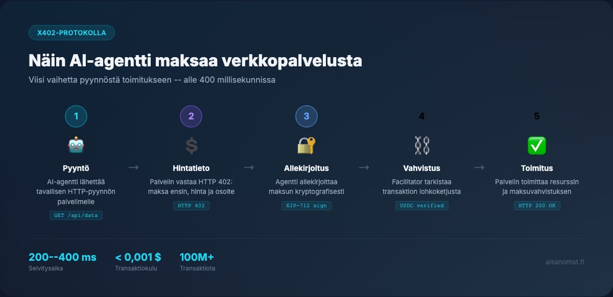 x402 on ensimmäinen vakavasti otettava yritys ratkaista AI-agenttien maksuongelma. Se ei ole täydellinen -- kryptoriippuvuus on aito kynnys, turvallisuuskysymykset ovat ratkaisematta ja tilastot kestävät lähempää tarkastelua. Mutta ekosysteemi on jo merkittävä: Google, Visa, Cloudflare ja kymmenet muut organisaatiot rakentavat sen päälle.